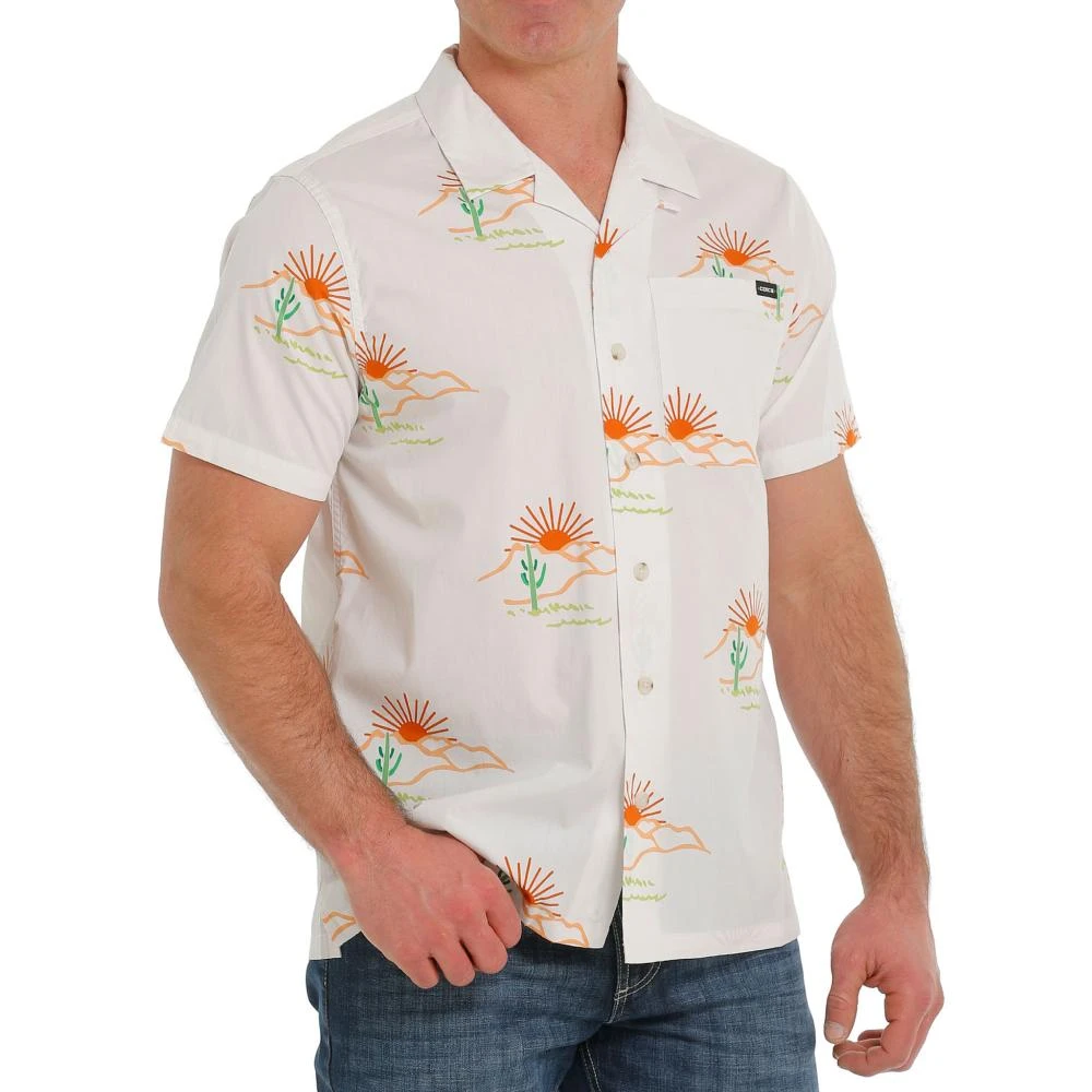 Fill the blanks in your casual-wear wardrobe with a comfortable cream-colored cotton plain weave camp shirt by CINCH. Featuring a print that reminds of sunrise over the desert, details include an open left front pocket, embroidered logo and marble shell buttons. Pair yours with blue jeans, khakis or your favorite shorts.