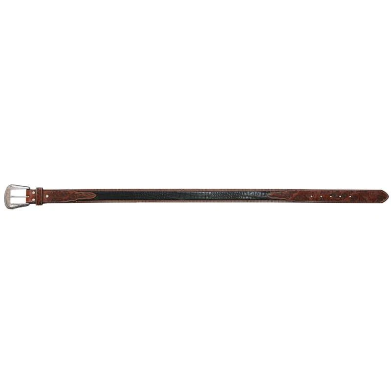 This Men’s Gator Tooled Brown and Black Belt is1 1/2″ wide. There is a floral engraved buckle and leather keeper.Â