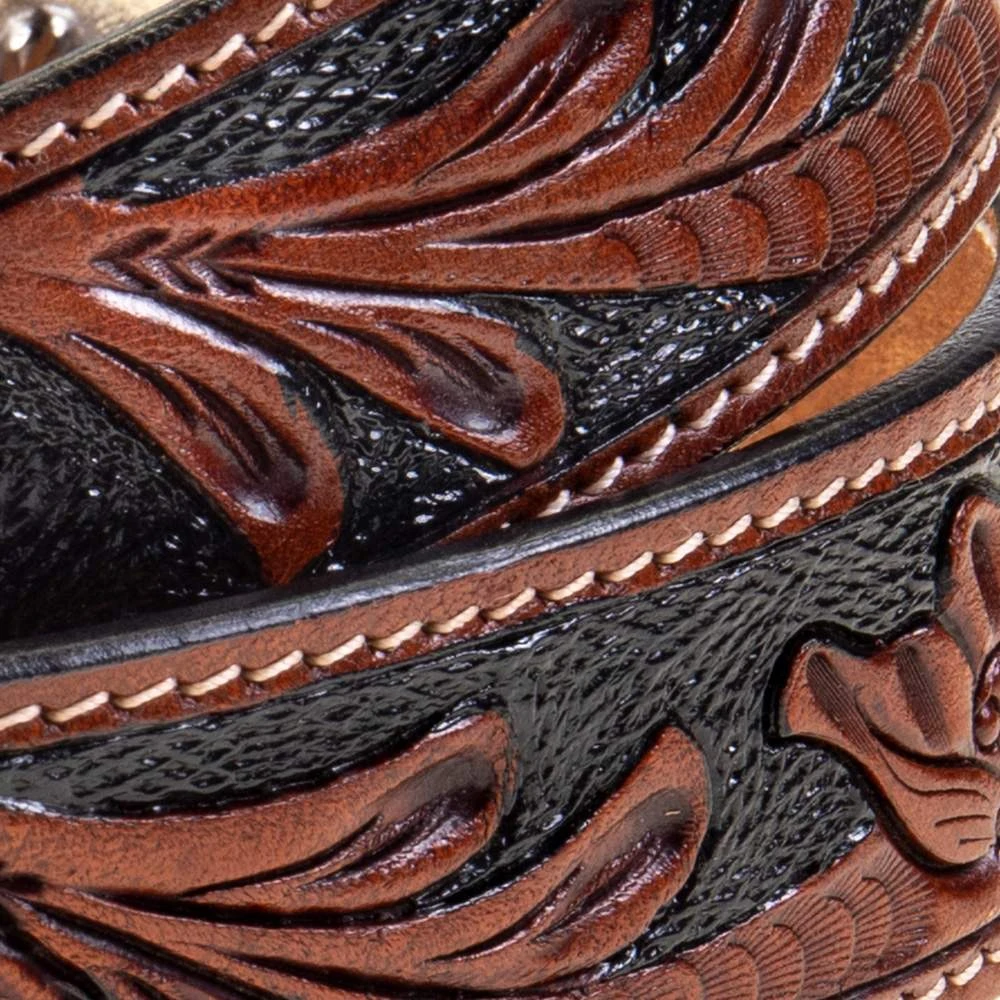 This belt features floral tooling with a hand painted black background, interchangeable silver buckle, leather stay and single stitch edges.