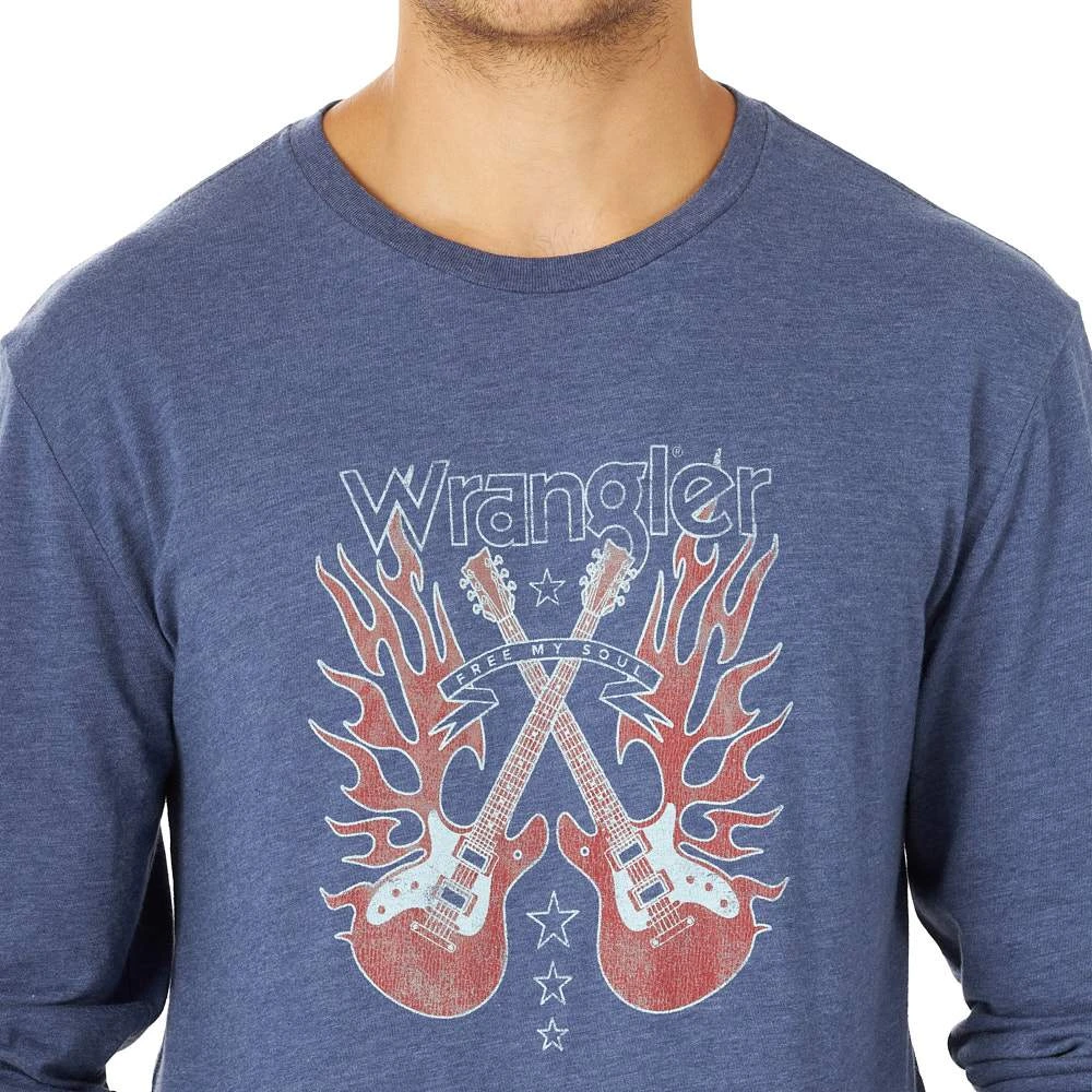Wrangler® and music go hand in hand. No matter what kind of music you listen to, you’ll appreciate the casual style of this classic crewneck long-sleeved tee. It’s crafted from a comfy yet durable cotton blend that will stand up to work, play, and everything in between. It comes with a unique screen-printed graphic across the front of dueling guitars and the logo you know so well. All you need to complete the look for a day off is your favorite pair of jeans.
