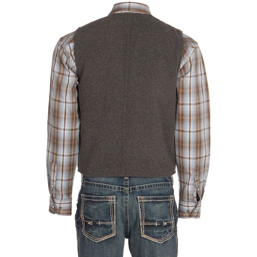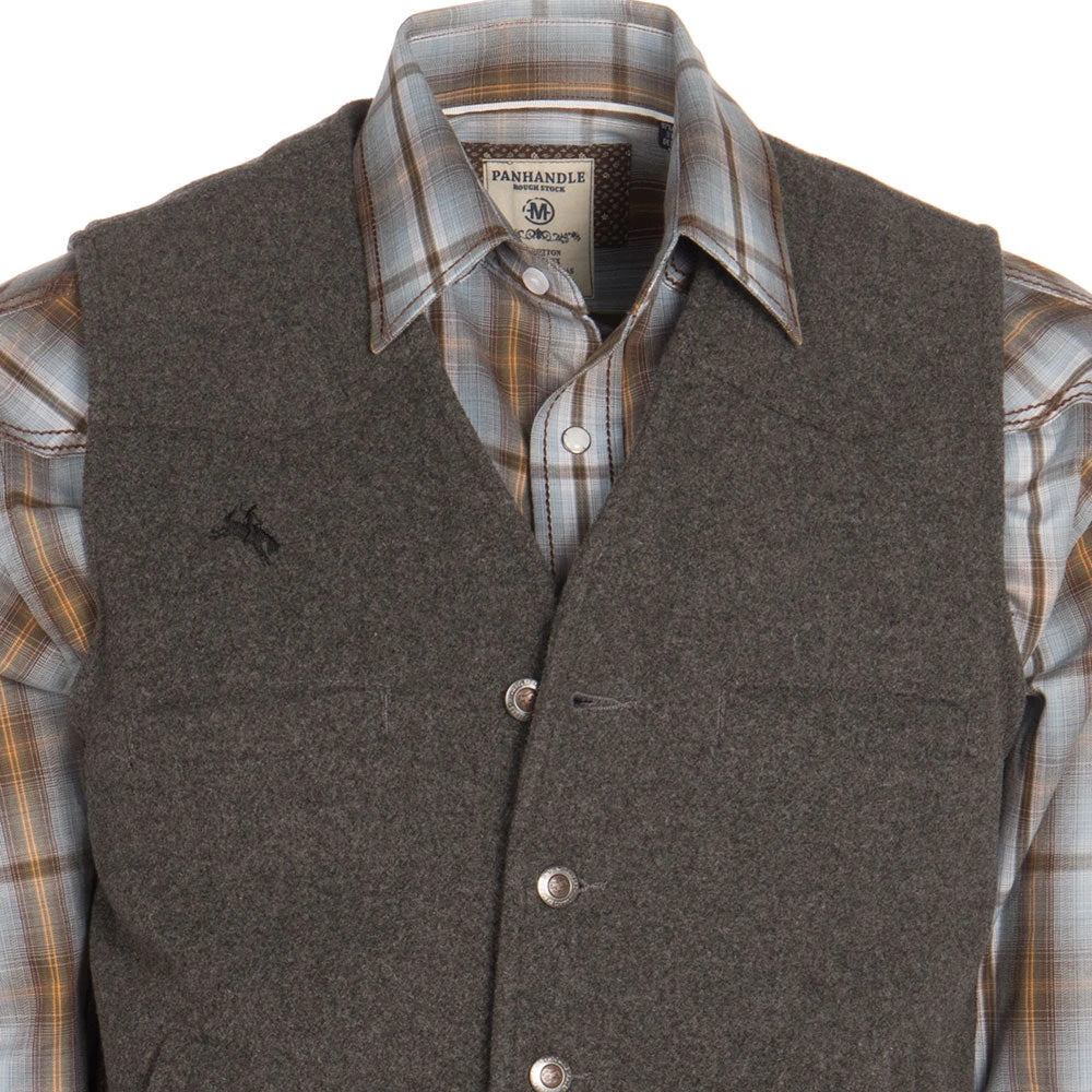 The Wyoming Wool Vest is made from 20oz Australian Wool and is naturally water resistant. The vest has several unique elements, one being the front shoulder western yoke, an open v-neck with five buttons and the lower western cut front. The vest is lined with polyester satin lining and has two inside wallet pockets. The vest also has four front welt pockets, two for your hands and two chest pockets; all lined with cotton. The back of this popular vest has a french back seam that gives it just the right touch. Dry Clean only. VCM-CHAR